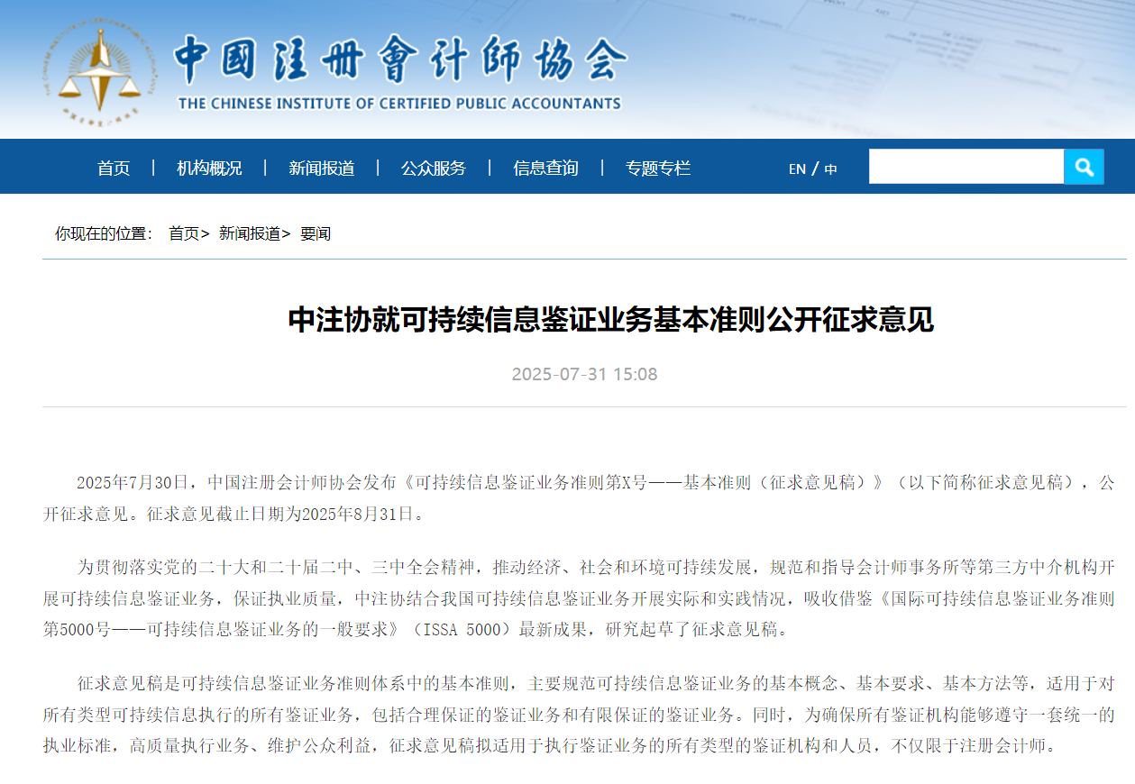 2025年7月30日,中国注册会计师协会(以下简称“中注协”)发布《可持续信息鉴证业务准则第X号——基本准则(征求意见稿)》(以下简称“征求意见稿”),向社会公开征求意见。这一举措标志着我国在ESG(环境、社会和公司治理)信息披露规范化方面迈出了重要一步,犹如一阵劲风,吹皱了行业的一池春水,无论是专业的会计师事务所,还是投身于ESG领域的从业者,乃至关注企业可持续发展的投资者和社会公众,都将目光聚焦于此。它不仅关乎着当下行业的规范与发展,更可能在未来重塑整个ESG信息披露和鉴证的格局,也为ESG分析师的职业发展带来了新的机遇与挑战。