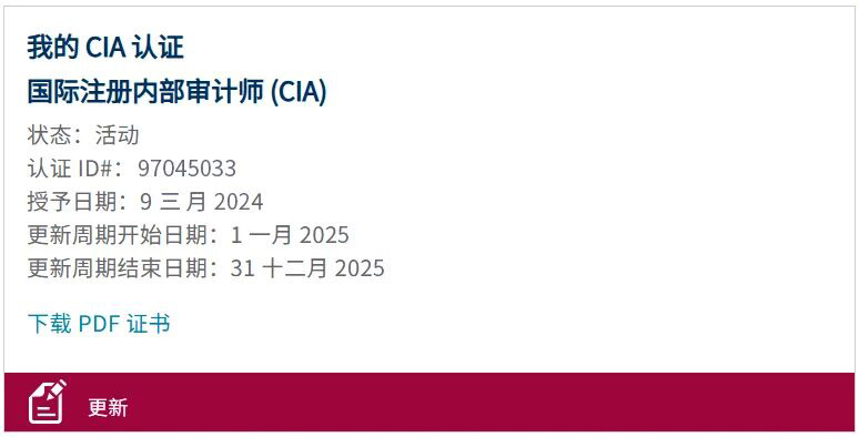 持证人员可以通过CCMS主页“我的CIA/CCSA/CRMA认证”下显示的“报告周期开始日期”和“报告周期结束日期”判断何时取得后续教育学时和参加年检,如下图所示: